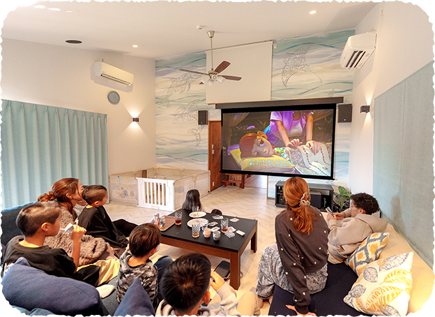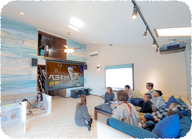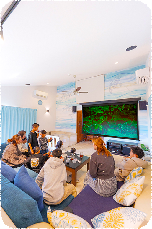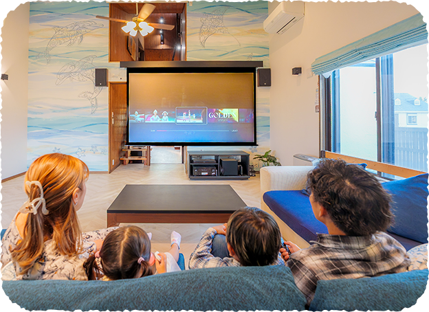 30㎡のひろびろリビングは、“おうち映画館”に大変身! 120インチの超大型スクリーン本格プロジェクター、天井埋め込みを含む7台のスピーカーが、迫力満点のサラウンド空間をつくり出します。​NetflixなどのネットアプリやTVはもちろん、お持込みのゲーム機、DVD・ブルーレイ、PCまで接続OK。