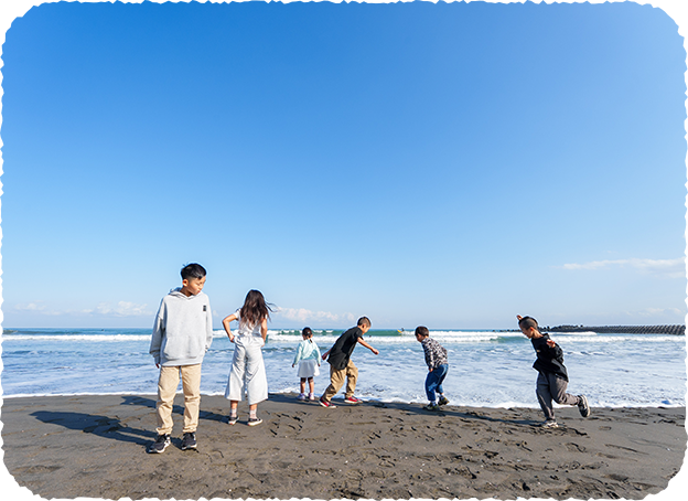 ひろ〜い砂浜と遠浅の海だから、波打ち際での水遊びも砂遊びデビューも安心。早起きした人だけのお楽しみ、空と海がオレンジ色に染まるサンライズタイムは感動必至!
