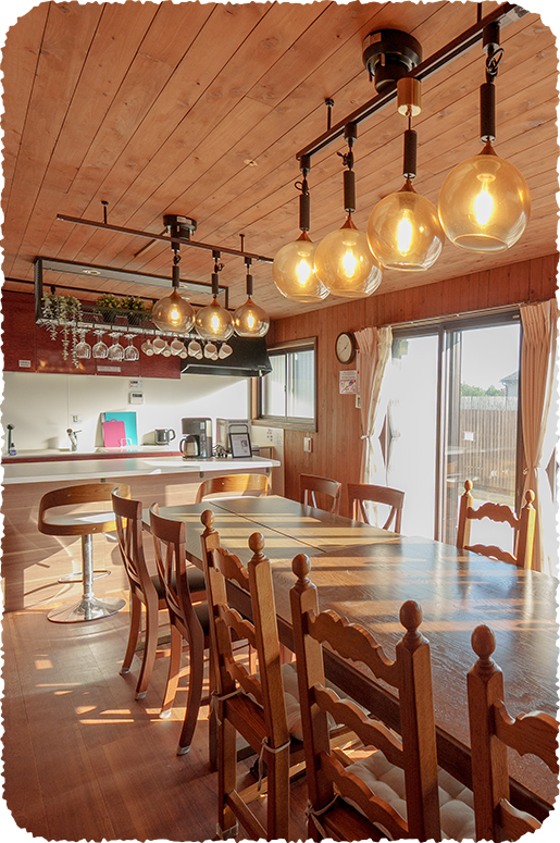 200㎡の大きな一棟には、寝室が5つ、最大16名まで泊まれます。親子三世代のビッグファミリーも、仲良し家族同士のグループでも、ゆったり楽々ステイ。みんなでワイワイ集まって泊まれば、楽しさも思い出も倍増、しかも一人あたりの宿泊費はぐっとおトクに!